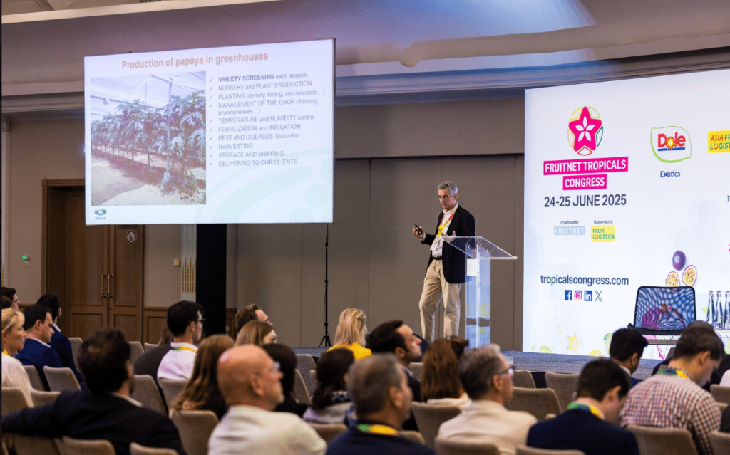 Por otro lado, los días 24 y 25 de junio se ha celebrado en Bélgica el Fruitnet Tropicals Congress, en el que intervino el director de Producción e Innovación, Ángel del Pino, que participó en una sesión dedicada a los desafíos de la producción local: cómo el aumento de las temperaturas y las nuevas tecnologías de producción han brindado a los productores europeos la oportunidad de suministrar al mercado una gama cada vez mayor de frutas tropicales de proximidad. Ángel utilizó como ejemplo la experiencia de Anecoop en el cultivo de papayas y pitahayas en España.