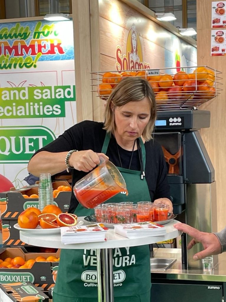 Las otras grandes protagonistas han sido sus nuevas líneas de naranjas rojas Bouquet, un programa en el que el Departamento de Producción e Innovación lleva tiempo trabajando en coordinación con varios socios, y del que tiene resultados muy interesantes. Para dar a conocer al público profesional su sabor y llamativo color, ofreció una degustación de zumo durante los tres días de certamen.
