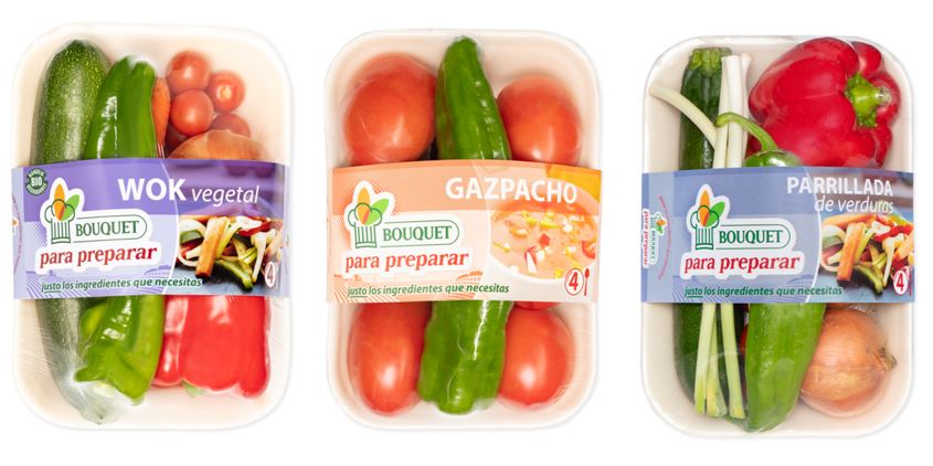 Bajo la marca “Bouquet para preparar”, Anecoop dispone la combinación justa de vegetales frescos de Primera Gama (es decir, sin pelar, cortar ni preparar) en una bandeja biodegradable, que incluye los ingredientes necesarios para elaborar un plato de forma fácil, siguiendo una sencilla receta.
