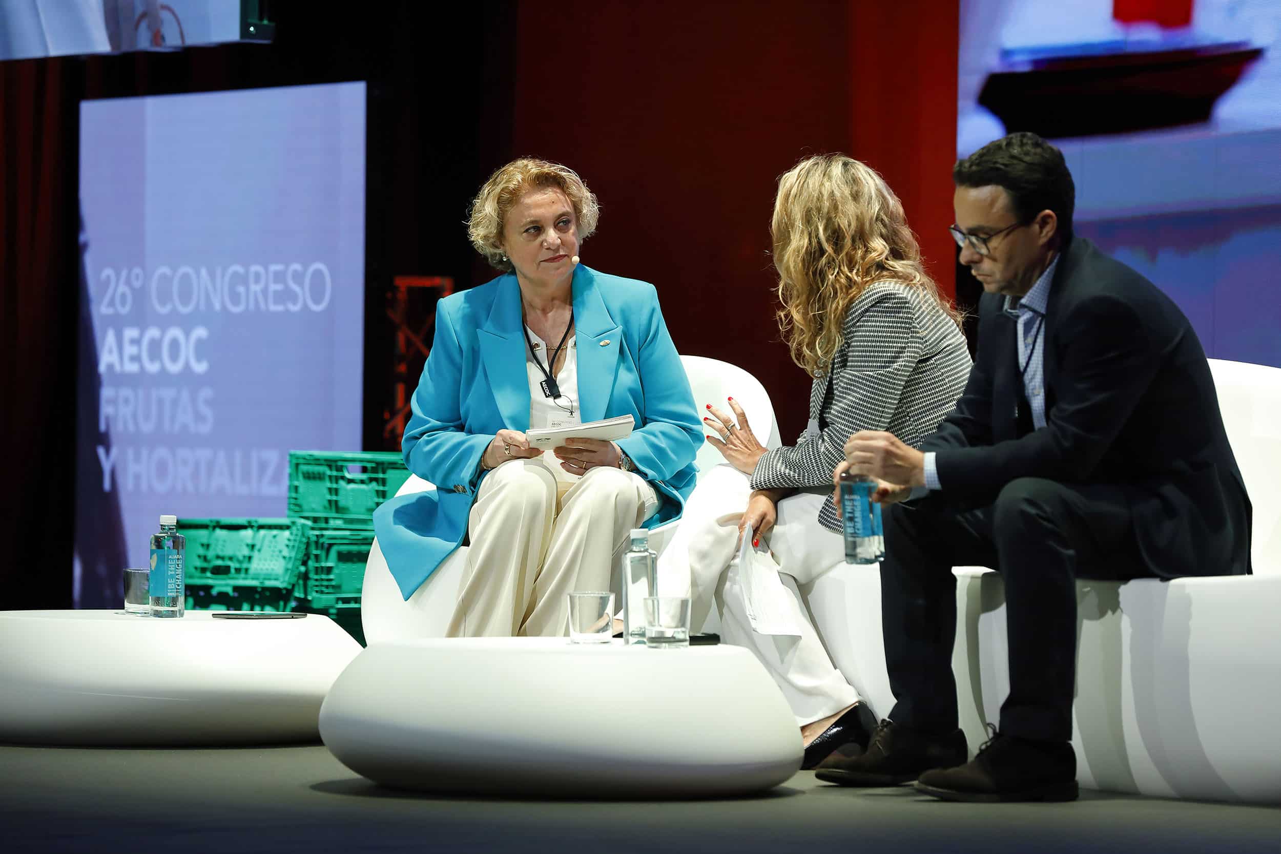 Imagen de archivo. Piedad Coscollá (izqda.) ejerció de moderadora en una mesa sobre consumo en el Congreso AECOC de Frutas y Hortalizas de 2024